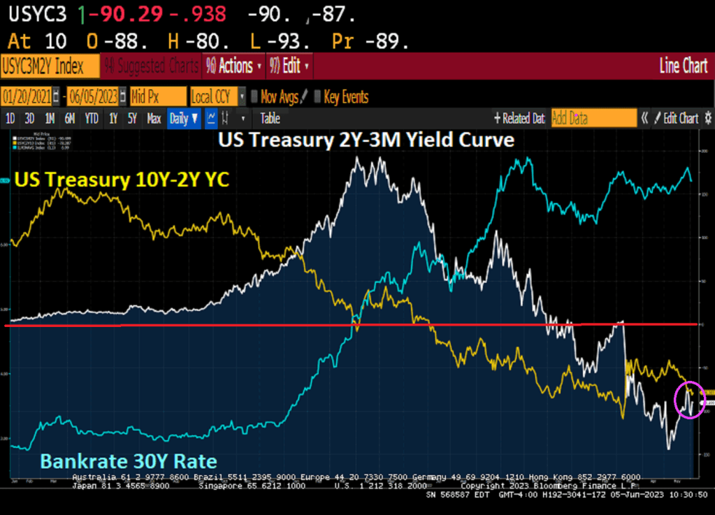 As The Fed tries to counter the years of excess monetary stimulus pre and post Covid by raising rates, we have seen mortgage rates rise 143% under Biden’s leadership. At the same time, the US Treasury yield curves (short 2Y-3m and long 10Y-2Y) remain deeply inverted.