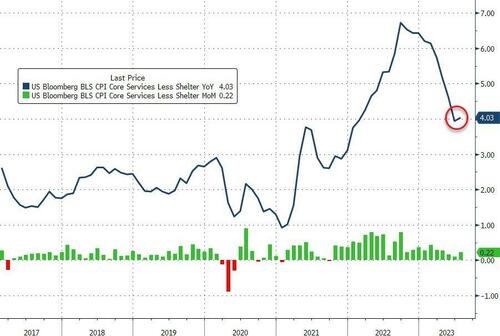 The silver lining here, as noted by former Fed staffer Julia Coronado, is that “we are seeing core inflation slow before the expected big step down in rent/oer” which is great news as “lots of price sensitivity in travel and core goods that was slow to take hold but is now fully coming through.” In other words, if and when rent/shelter inflation actually post a decline (with the usual 12-18 month BLS lag), the Fed will be scrambling to fight inflation.