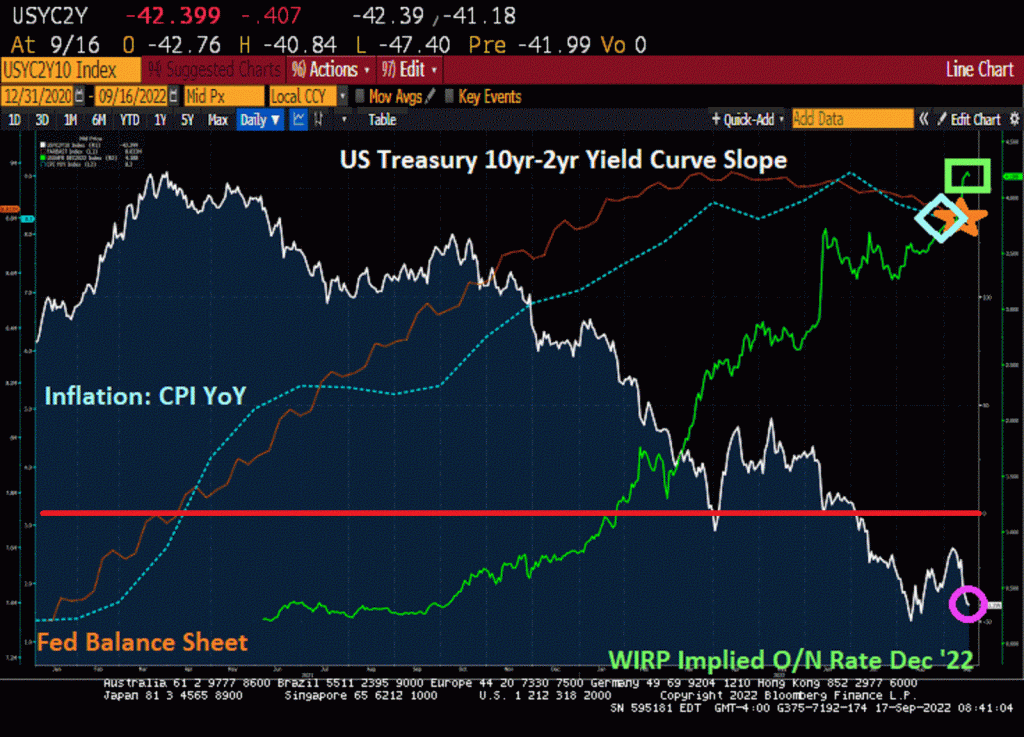 Let’s begin with the US Treasury 10yr-2yr yield curve slope. Historically, the yield curve inverts prior to a recession. As of this sunny morning, the US Treasury yield curve is inverted and sinking further into inversion. Notice that headline inflation (blue line) has increased declined slightly after hitting 40-year highs as The Federal Reserve begins SLOWLY trimming their balance sheet (orange line). The green line is the expectation of Fed rate hikes by the December 2022 FOMC meeting indicating further monetary tightening.