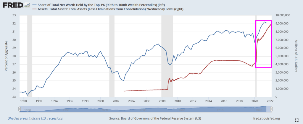 Answer? The top 1%. The share of total net worth spiked dramatically after the Fed infusion.
