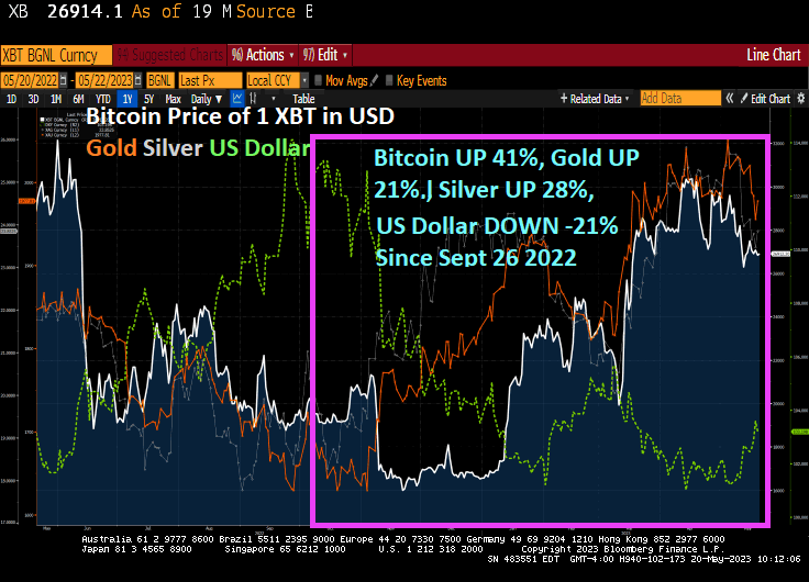So since September 26, 2022, we have seen a fundametal shift in markets. The US Dollar is down -21% since September 26, 2022 while Bitcoin is up 41%, Gold is up 21% and Silver is up 28%.