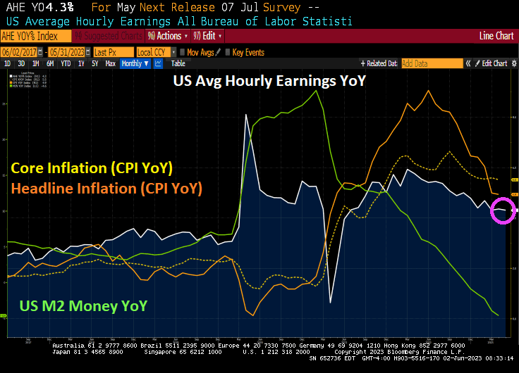 The bad news? While US average hourly earnings YoY cooled to 4.3%, inflation is still roaring at 4.9% (headline) and 5.5% (core). So Americans are still losing ground to inflation.