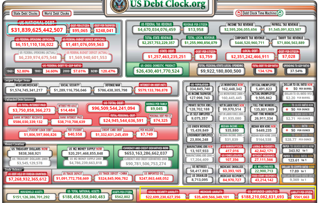 US debt stands at $31.8 TRILLION with $188 TRILLION in unfunded liabilities (which means higher personal taxes and much more debt).